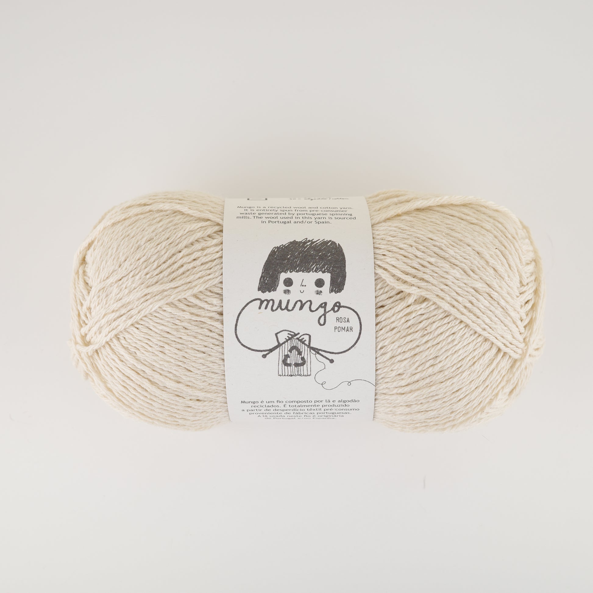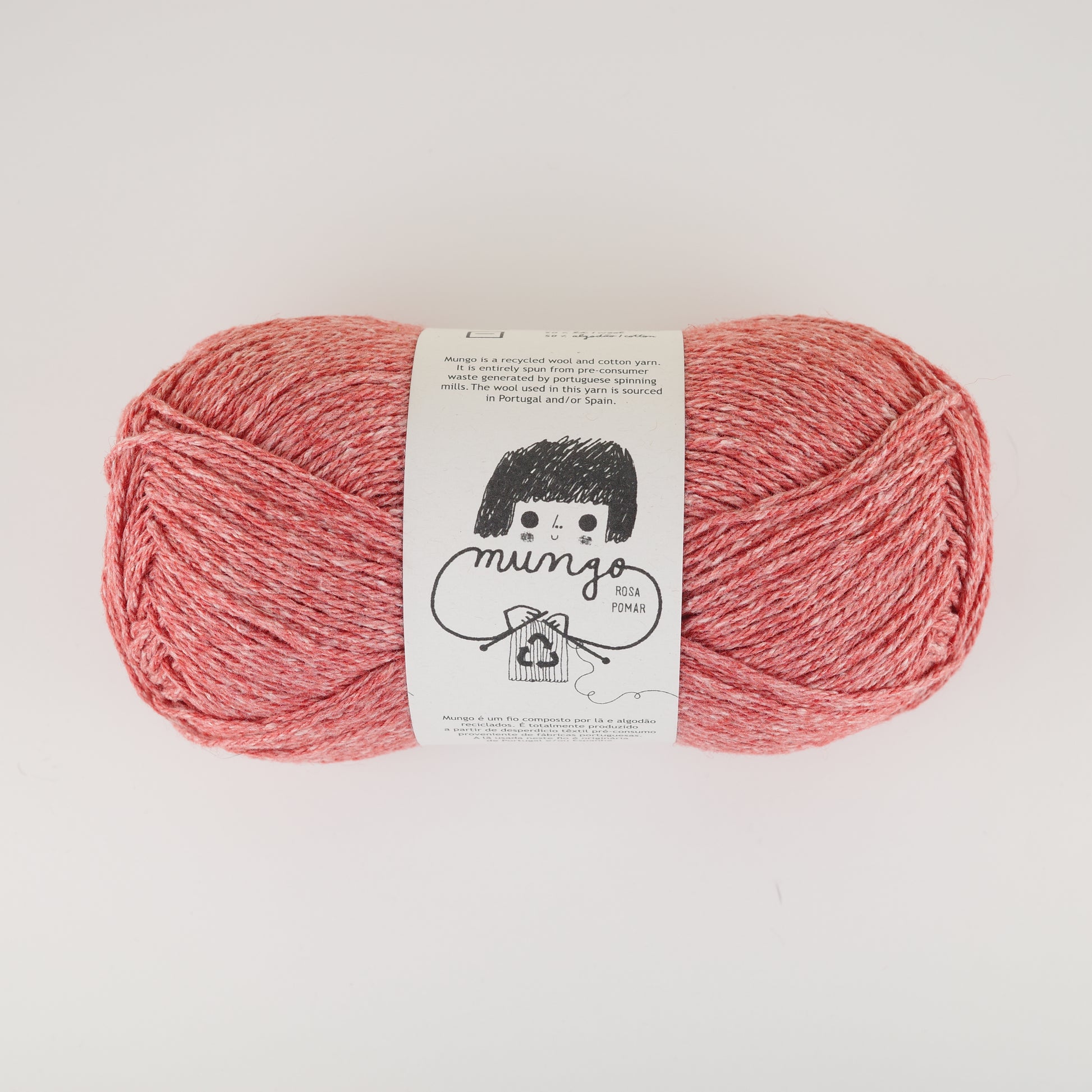 ポルトガルの紡績工場の製造工程で出るプレ・コンシューマ材(商品化出来ない半端材など使用前に再利用される素材)を再生して紡いだ糸です。ウールの弾力とコットンのさっぱり感が肌に優しく、メランジ調の表情豊かな編地は春先から秋頃までのカジュアルなウェアから小物まで幅広く活躍します。Rosa Pomarならではのかわいいラベルと色味も魅力です。
