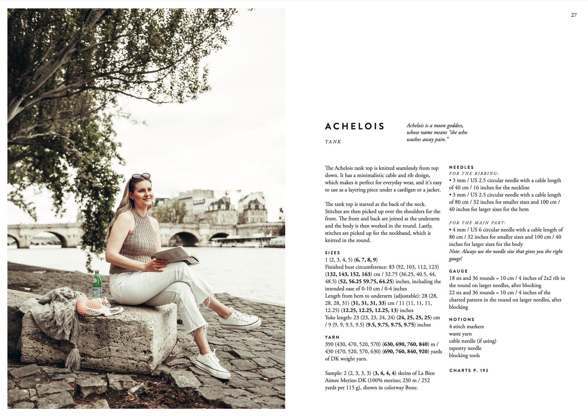 ※世界中で最も人気の高いフィンランドのニットデザイナーSari Nordlundさんのニットウエア22パターンを掲載。それぞれのパターンはギリシャ神話の女神にちなんで名付けられています。彼女の美しく繊細なニットがパリの風景と見事に調和した美しいパターンブックです。
