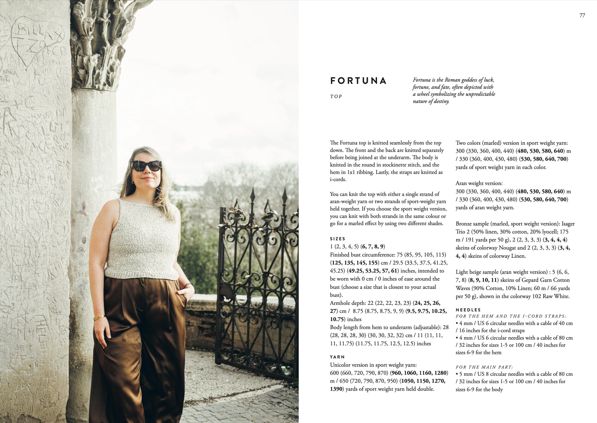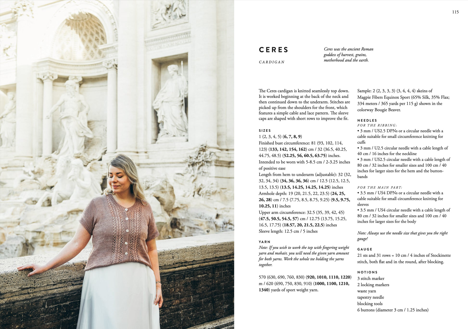 ※フィンランドの人気ニットデザイナーSari Nordlundさんによる夏の編み物コレクション。古代ローマの女神に着想を得た23点の軽やかなトップスやドレス、スカーフが、ローマの光の中で撮影され、夏の優雅さと心地よさを表現しています。初心者にもわかりやすい丁寧な解説付きで、すべての編み手にインスピレーションを与えてくれます。